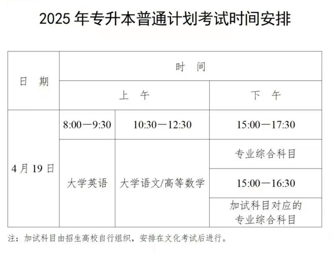 考生要在4月16日至4月19日期间登录“专升本信息平台”,自行下载并打印准考证,按照报考高校要求做好考前准备。普通计划考试将于4月19日-20日举行。